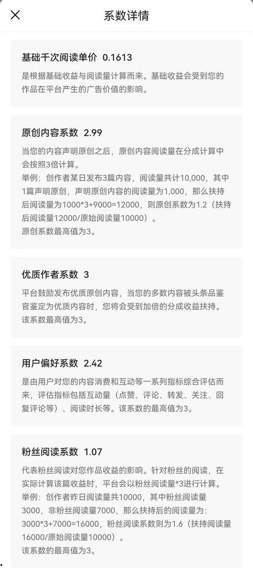 首先,我们来了解一下什么是头条收益单价。简单来说,头条收益单价就是你在头条上发布的每一条内容所能获得的收益。这个数字直接关系到你的收入水平,所以了解它至关重要。